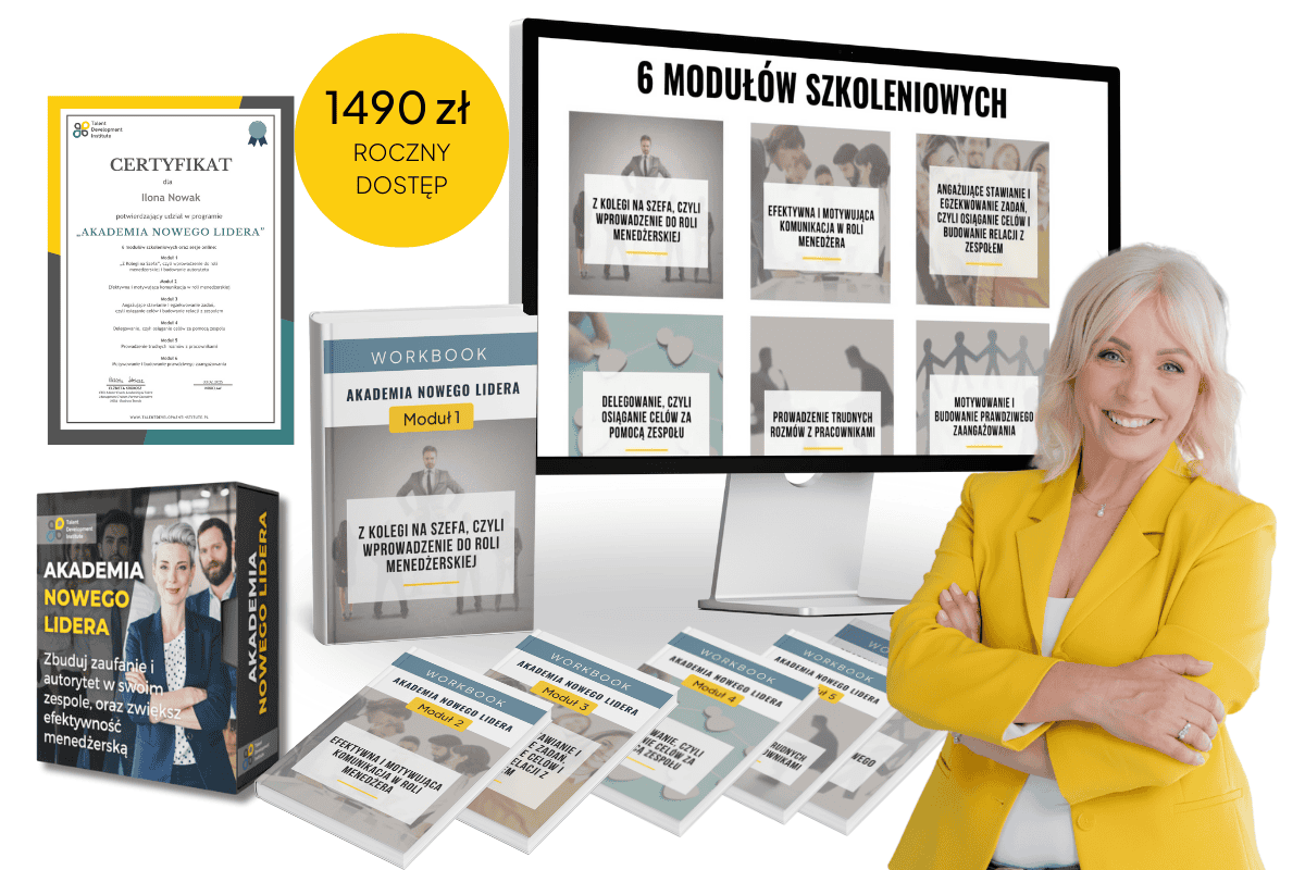 Wiem, jak trudna jest droga od eksperta do lidera – jak łatwo wpaść w pułapkę "Zosi Samosi", mieć trudność z delegowaniem i egzekwowaniem obowiązków. Dlatego stworzyłam Akademię Nowego Lidera – praktyczny kurs, który pomoże Ci stać się skutecznym liderem bez stresu i rezygnowania z dobrych relacji w zespole.